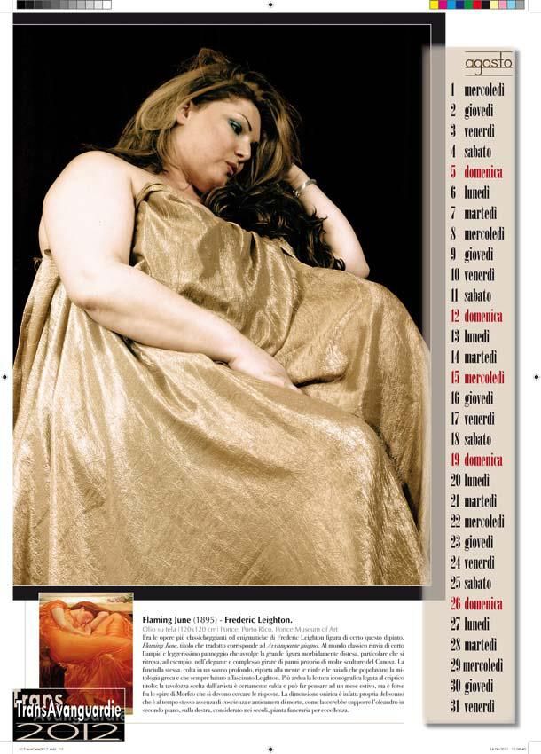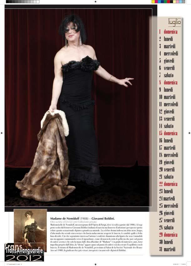 Se i media ci dipingono male…noi ci dipingiamo da sole!!! Siamo alla seconda edizione dell’iniziativa Transavanguardie che, per chi non ha seguito la prima, non è riferita alla corrente pittorica di fine secolo scorso, ma al gioco di parole che il termine contiene. Iniziativa realizzata in collaborazione con il maestro della luce Fudesan, per affermare il concetto esposto nel sottotitolo dell’iniziativa: “Se i media ci dipingono male…noi ci dipingiamo da sole.“ Come la volta scorsa, anche in questa iniziativa nel corso di serate spettacolo abbiamo riprodotto dal vivo ed immortalato negli scatti di Fudesan, opere pittoriche più o meno note, con figure transgender al posto dei personaggi. Ciò che vogliamo dipingere è un’immagine che poche volte è riconosciuta, quella di persone che hanno conoscenze culturali, hanno talenti espressivi, hanno iniziativa proprio come ogni qualsiasi altra persona ha, ma che come categoria transgender, è un’immagine spesso non colta perché si preferisce portare agli “onori” della cronaca, situazioni che rasentano la morbosità più che le problematiche inflitte da una società non informata. Desideriamo con la nostra ironia e preparazione farvi vedere che ci siamo, che abbiamo bisogno del vostro aiuto per la solidarietà su cose apparentemente elementari ma che per le persone tansgender e quelle in transizione in particolare, diventano a volte montagne da scalare. Il tema pittorico di quest’anno sono “Ritratti di Dame”, quindi ritratti singoli di donne, donne che hanno ispirato l’artista che le ha ritratte….donne che hanno amato e sono state amate. Come nella scorsa edizione desidero dedicare il calendario. Quest’anno è dedicato a tutte coloro che lottano per il loro diritto all’amore, alla realizzazione e conservazione legale del rapporto sentimentale, che spesso per leggi bieche e ingiuste, condanna a non riconoscere legalmente un’unione od addirittura ad una separazione legale chi separarsi non lo vorrebbe mai. In bocca al lupo Alessandra.